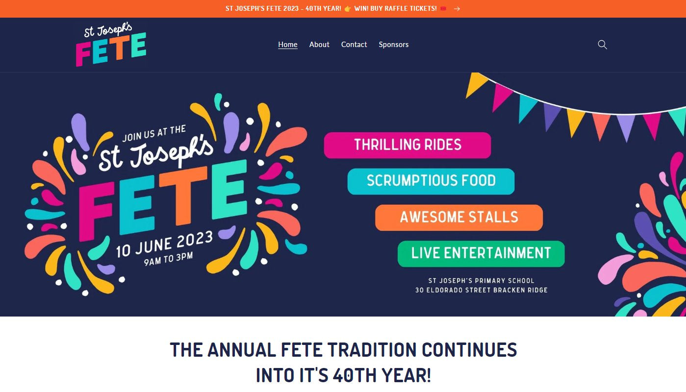A modern landing page for a large school fete showcasing the different stalls and sponsors along with the schedule of entertainment to be held on the day. A Mega Raffle was also promoted with its own page that directed customers to Raffletix to purchase tickets. An online shop was set up the week before the big day for the sale of ride passes, games tickets, cent auction tickets and showbags, allowing customers to buy ahead and skip the queues!
